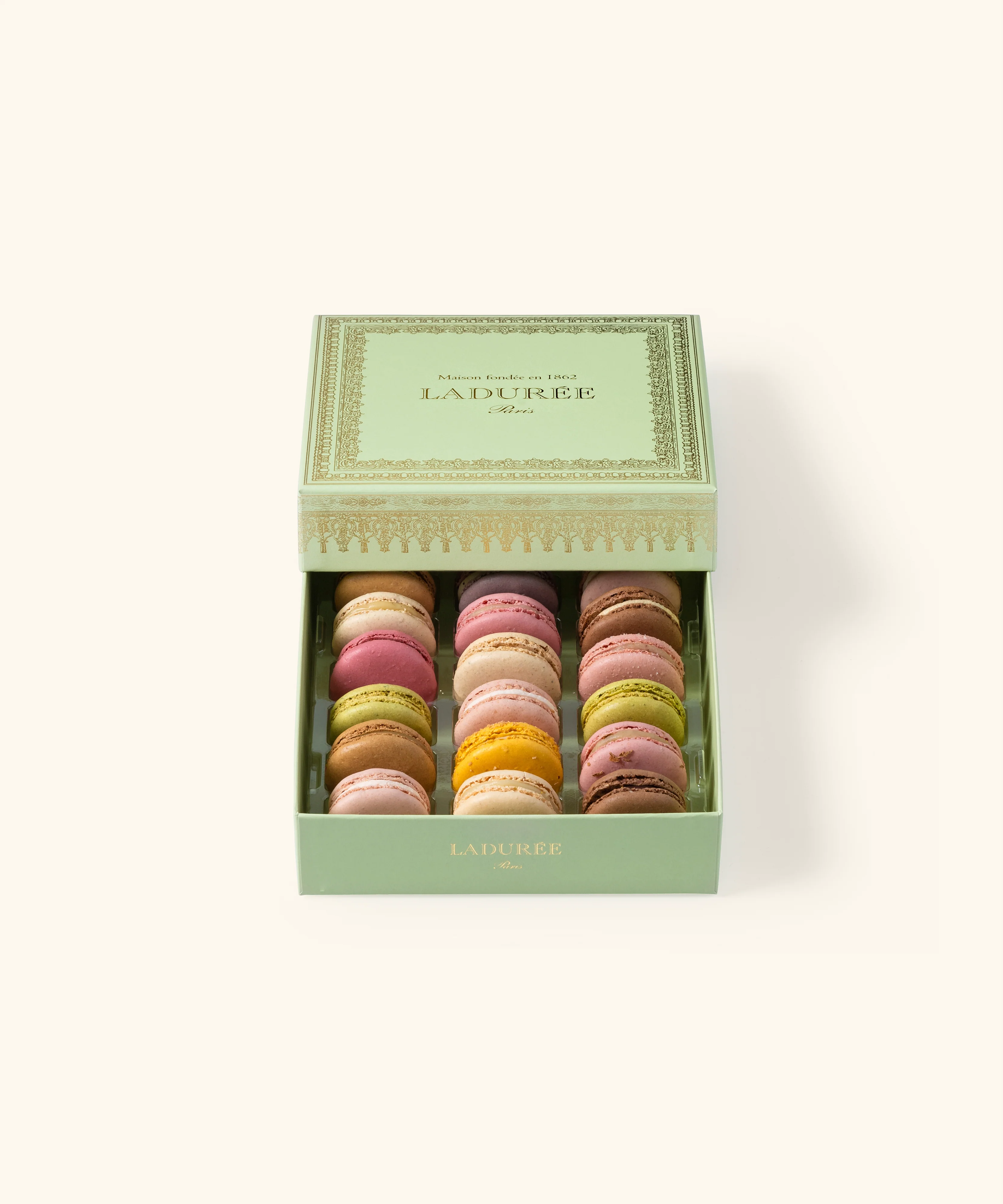 Succombez au raffinement intemporel du coffret "Napoléon" vert, une pièce emblématique de la Maison Ladurée. Inspiré du style Napoléon III, son design élégant est sublimé par une frise argentée délicate, symbole d’histoire et de tradition. À l’intérieur, découvrez une sélection de 18 macarons assortis, alliant les parfums incontournables et les créations saisonnières de la Maison.