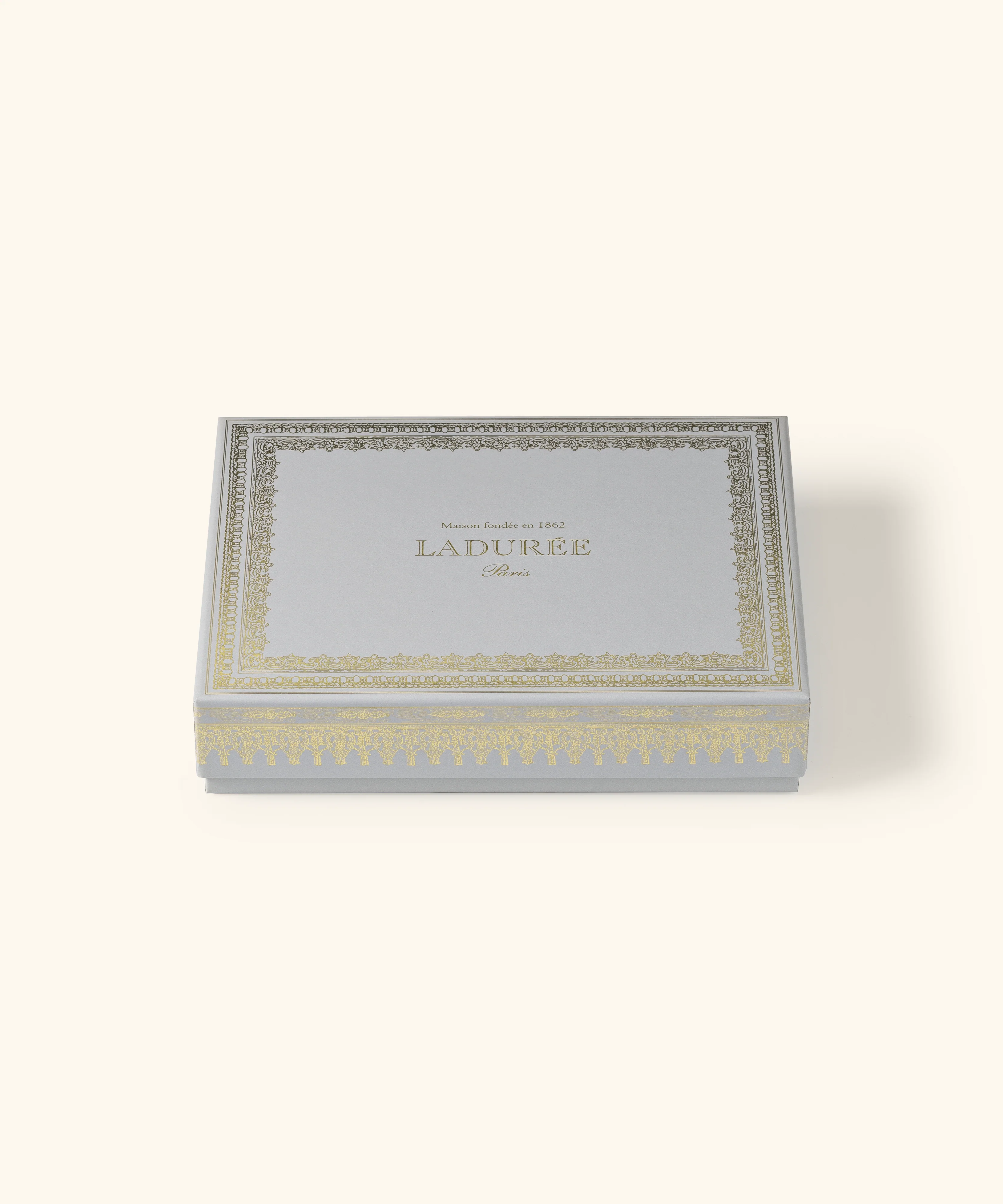 Coffret de 24 macarons gris orné d'une frise argentée en hommage à Napoléon III.